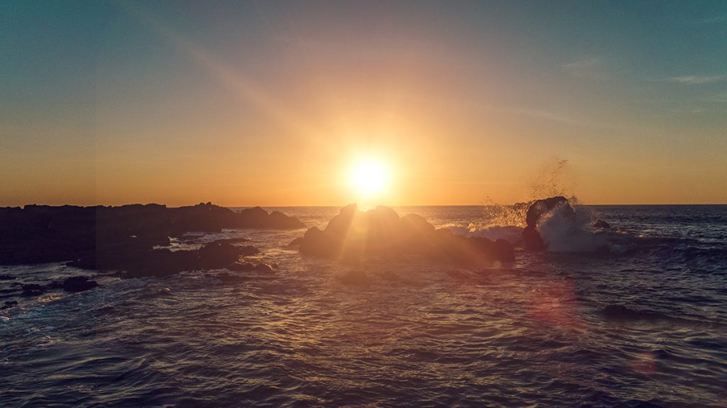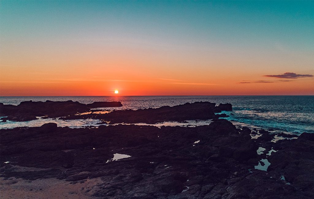 Desde las 5:30 pm, el cielo se transforma en una paleta de colores que van del dorado al púrpura. El mejor mirador natural son las rocas que dividen la playa en dos sectores: hacia el norte, aguas tranquilas ideales para familias; al sur, olas suaves perfectas para nadar.